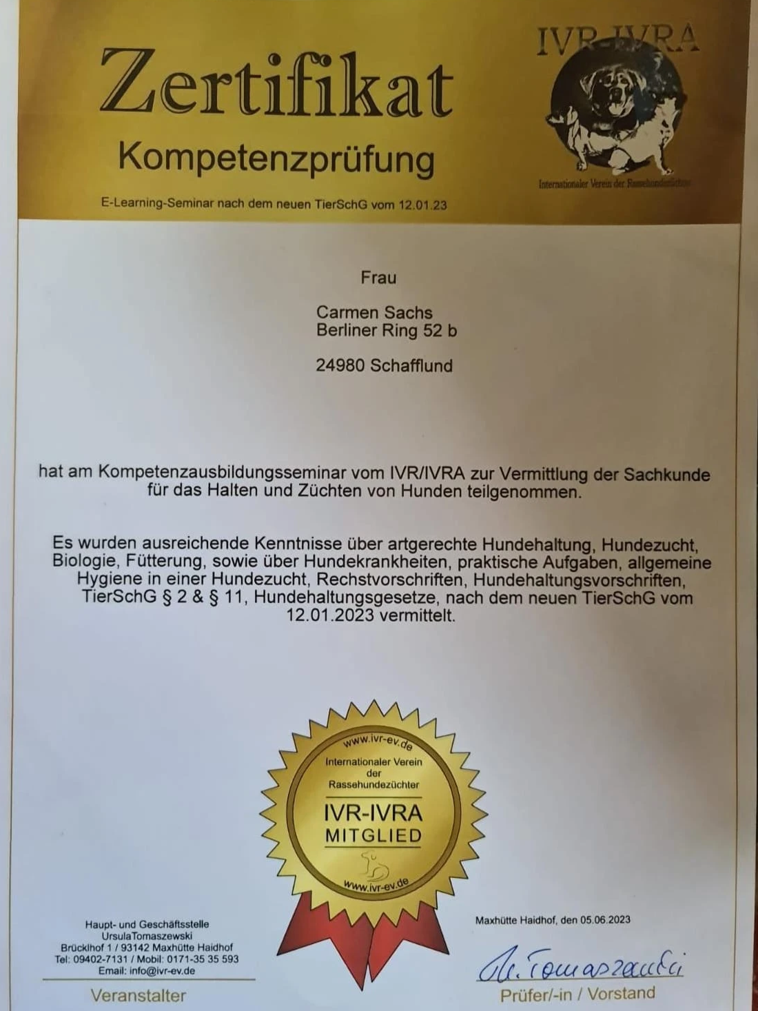 Nun habe ich meine eigene, eingetragene Zucht im EBF.ev.. Ich habe meine Sachkundeprüfung nach §11 &§2 erfolgreich abgeschlossen.